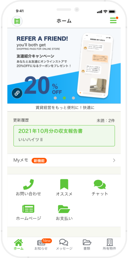 毎月の収支報告や担当者との連絡、お問い合わせなど、専用アプリでこと細かくオーナー様をサポートします。